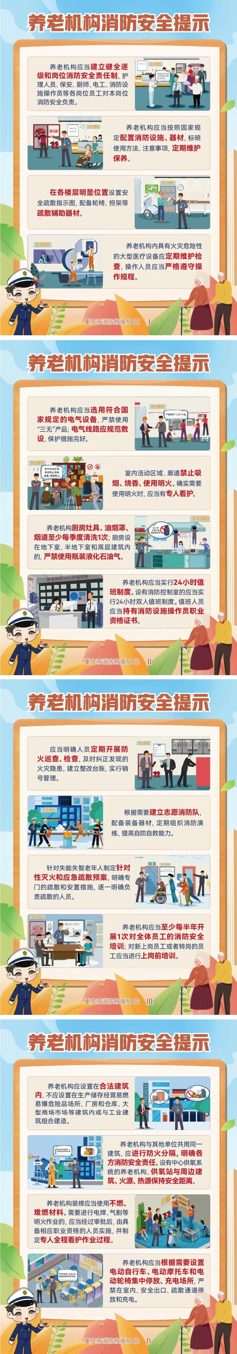 养老服务机构是老年人集中生活的人员密集场所,一旦发生火灾,极易造成严重的人员伤亡和财产损失。如何做好养老机构消防安全工作,守护好“夕阳红”的安全底线?这份消防安全提示请收好。