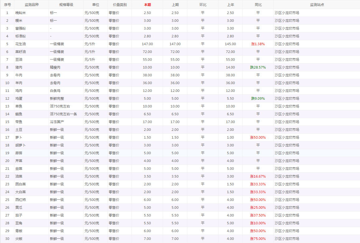 粮油内禽蛋菜水产品等价格应急监测情况(小龙坎农贸市场)采价日期(2025年12月26日)