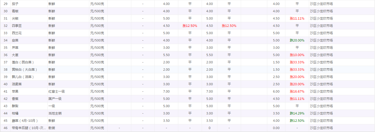 粮油内禽蛋菜水产品等价格应急监测情况(重百超市、小龙坎农贸市场)采价日期(2026年4月29日)