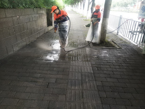 此次行动整治的重点为辖区内主、次干道以及卫生死角的清理、保洁、垃圾清运和道路冲洗、路面杂草和青苔清理。采取“人工+机械”的模式对道路进行清扫,对岗亭顶部此类卫生死角采取人工搭梯的方法捡拾,发现暴露垃圾及时用手推车和平板车进行清运;道路冲洗工作采取先刷洗、最后冲的方式对路面进行冲洗,对辖区护栏、墙壁进行冲刷、洗扫、捡拾,做到机械化与人工循环保洁,无缝衔接治理“脏、乱、差”现象;发现路面杂草、青苔,用高压水枪对地面青苔进行冲洗,人工拔除石缝杂草。