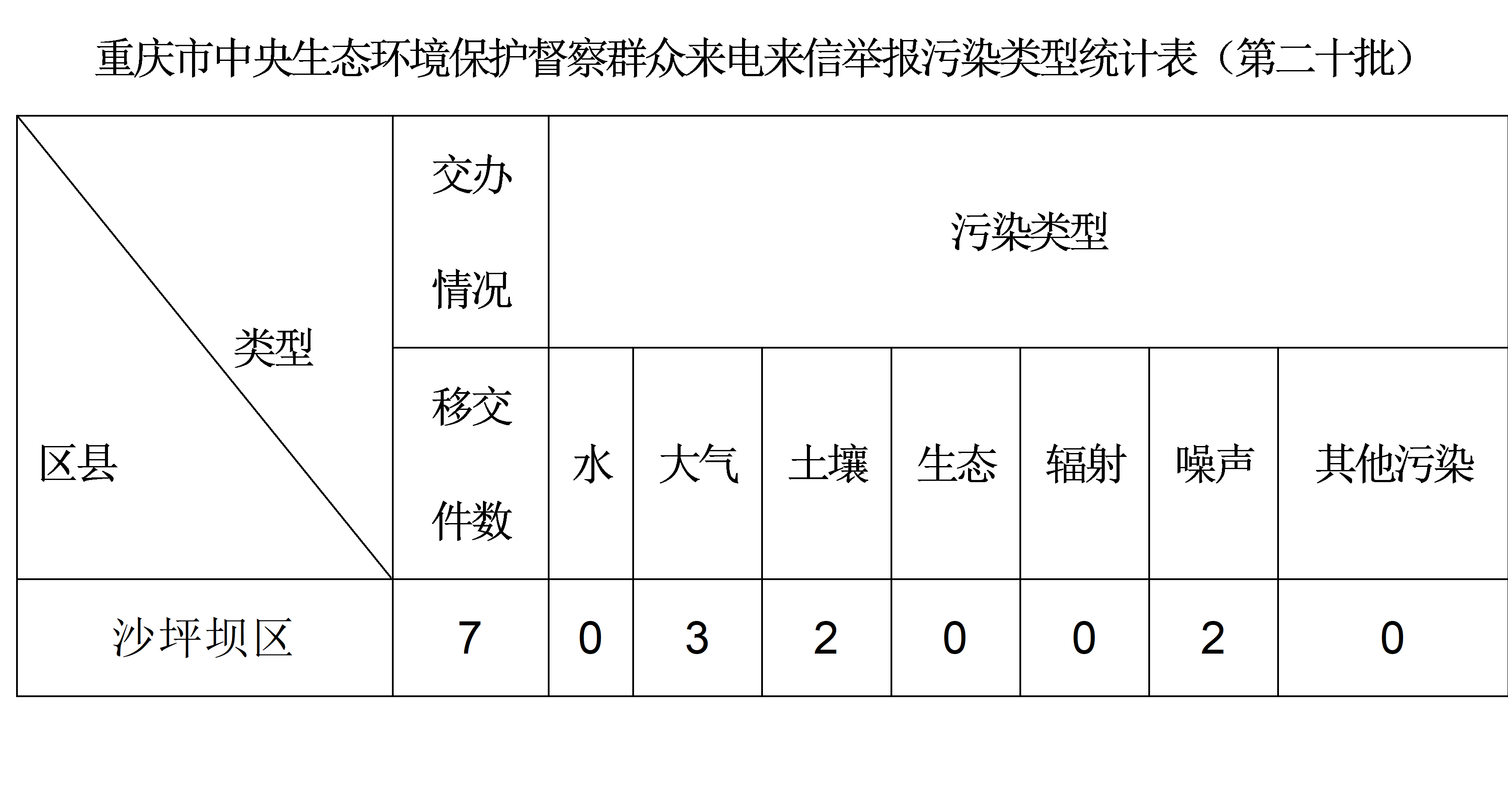 中央第六生态环境保护督察组向重庆市交办第二十批群众信访举报件107件,涉及沙坪坝区7件