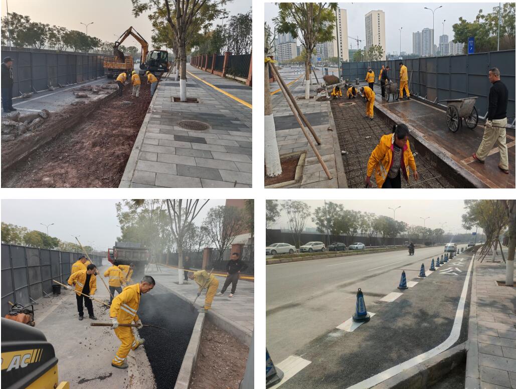该工程共拆除人行道绿化带约66平方米、路沿石33米、清除停车位线12平方米、迁改路灯1座,安装路沿石8米,铺设碎石垫层66平方米,制作安装钢筋网片66平方米,浇筑混凝土基层19立方米,浇筑路灯基础、铺设沥青面层66平方米,划线20平方米,目前公交站台建设已全部完工。