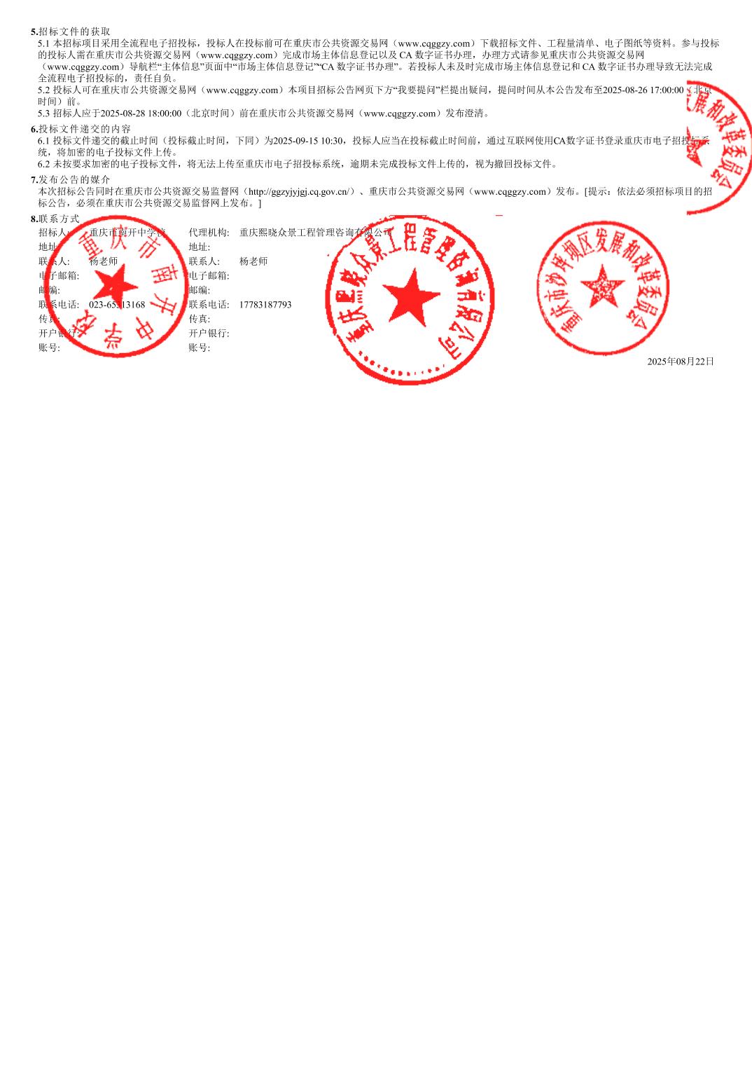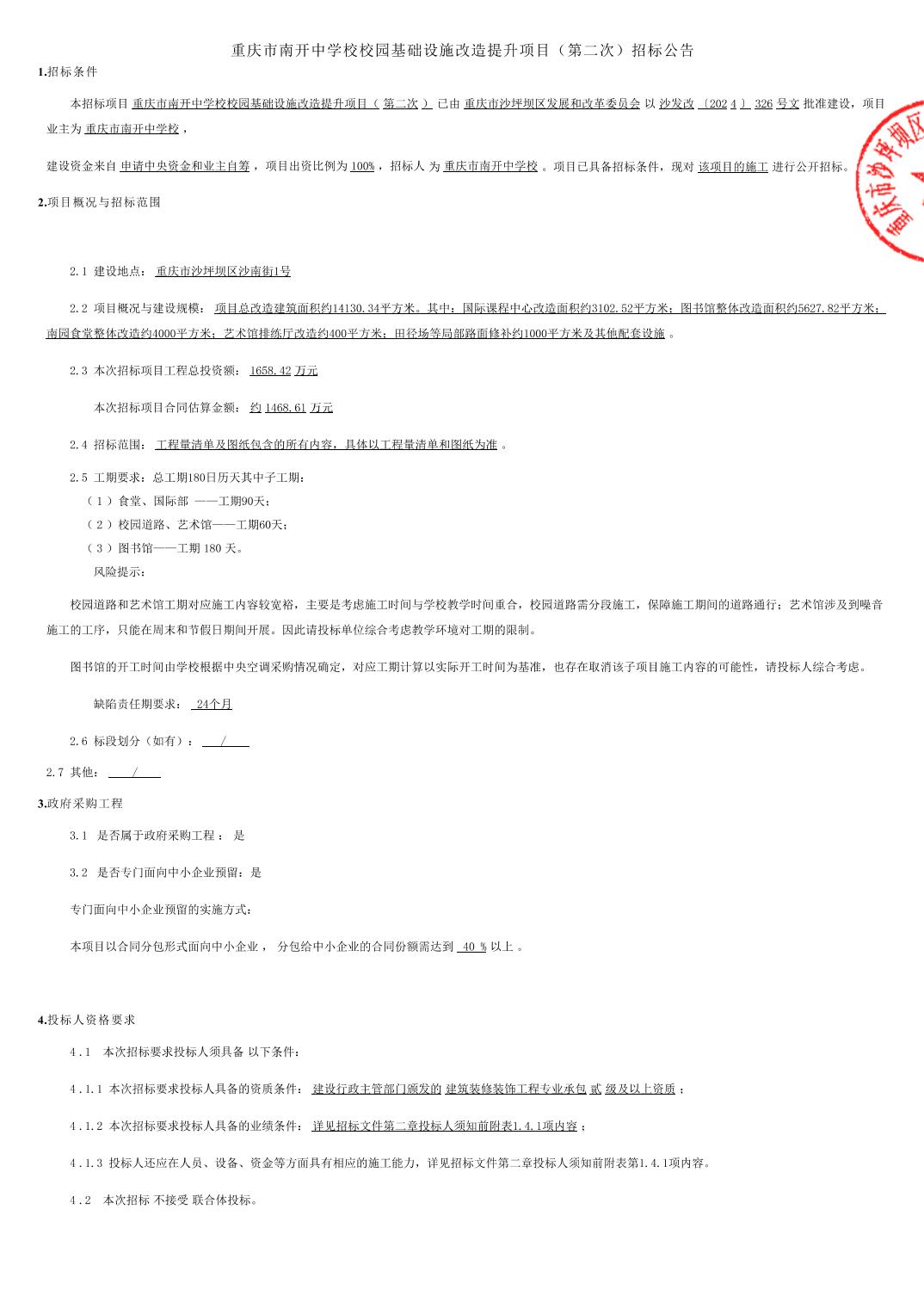 重庆市南开中学校校园基础设施改造提升项目(第二次)招标公告
