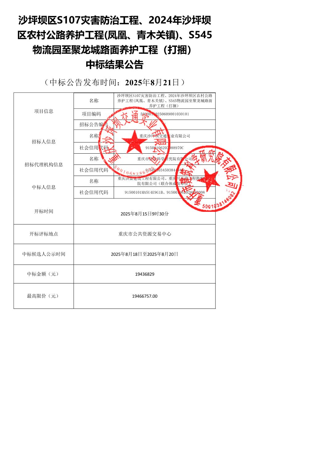 沙坪坝区S107灾害防治工程、2024年沙坪坝区农村公路养护工程(凤凰、青木关镇)、S545物流园至聚龙城路面养护工程(打捆)中标结果公告
