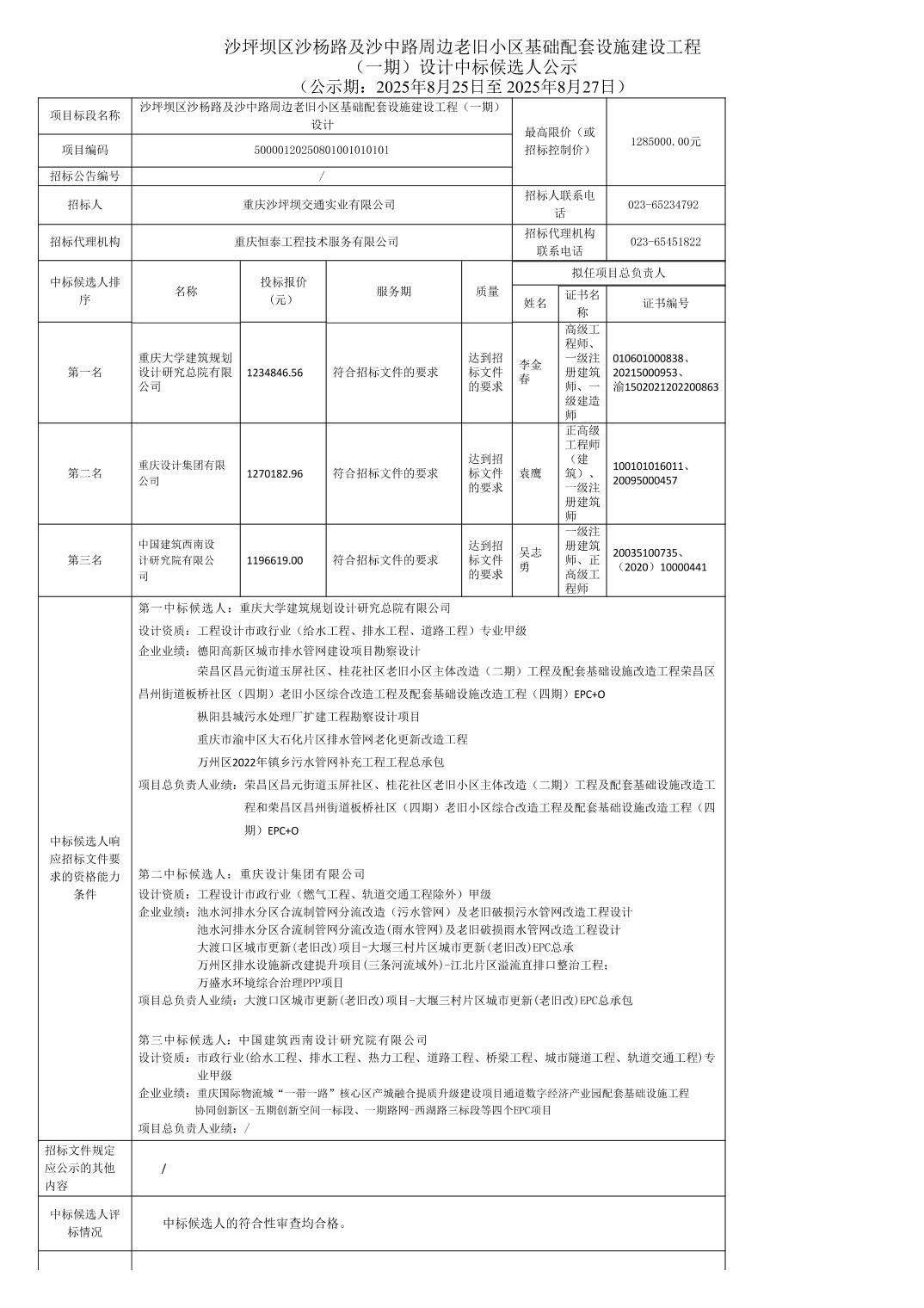沙坪坝区沙杨路及沙中路周边老旧小区基础配套设施建设工程(一期)设计中标候选人公示