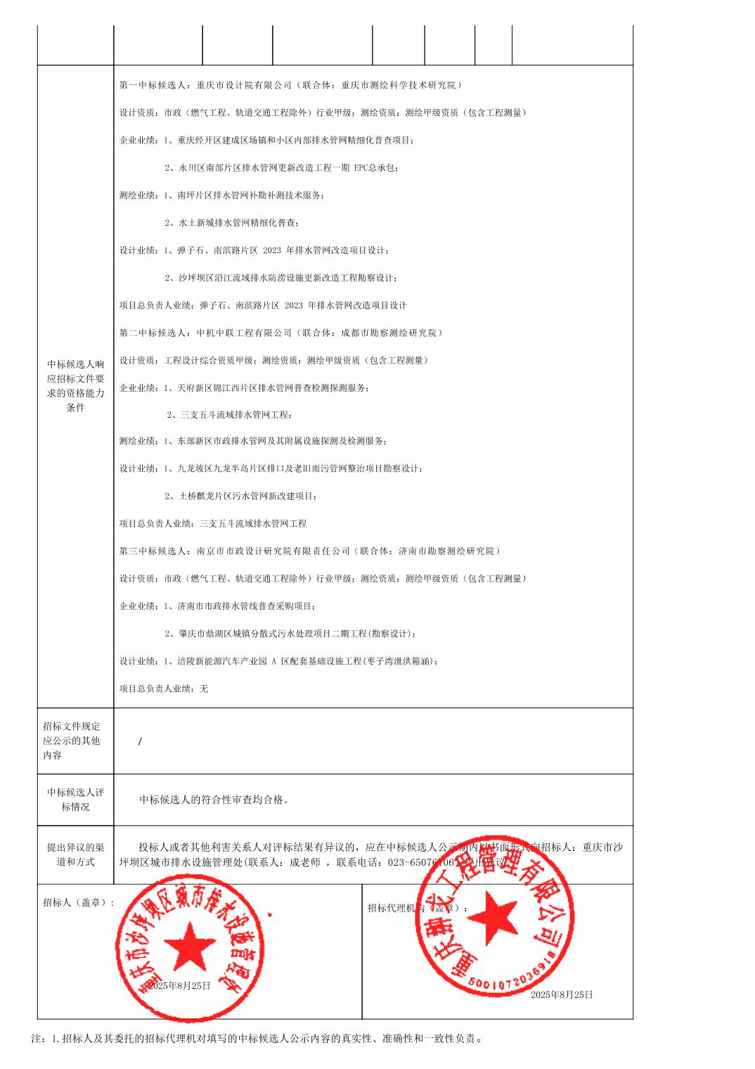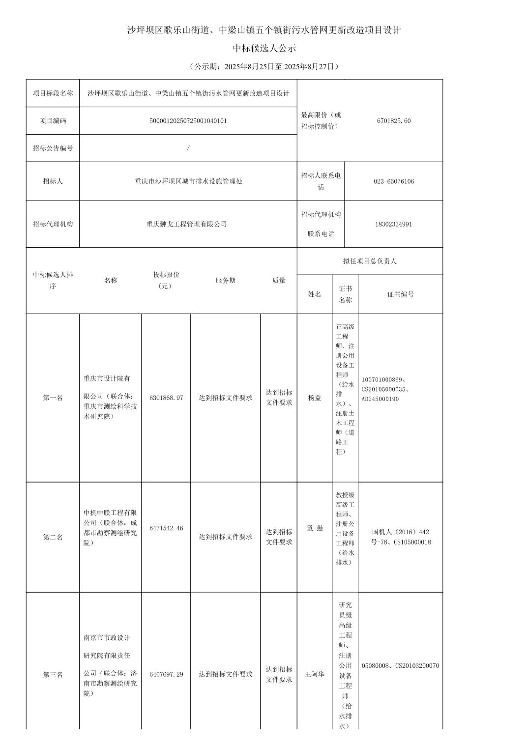 沙坪坝区歌乐山街道、中梁山镇五个镇街污水管网更新改造项目设计中标候选人公示