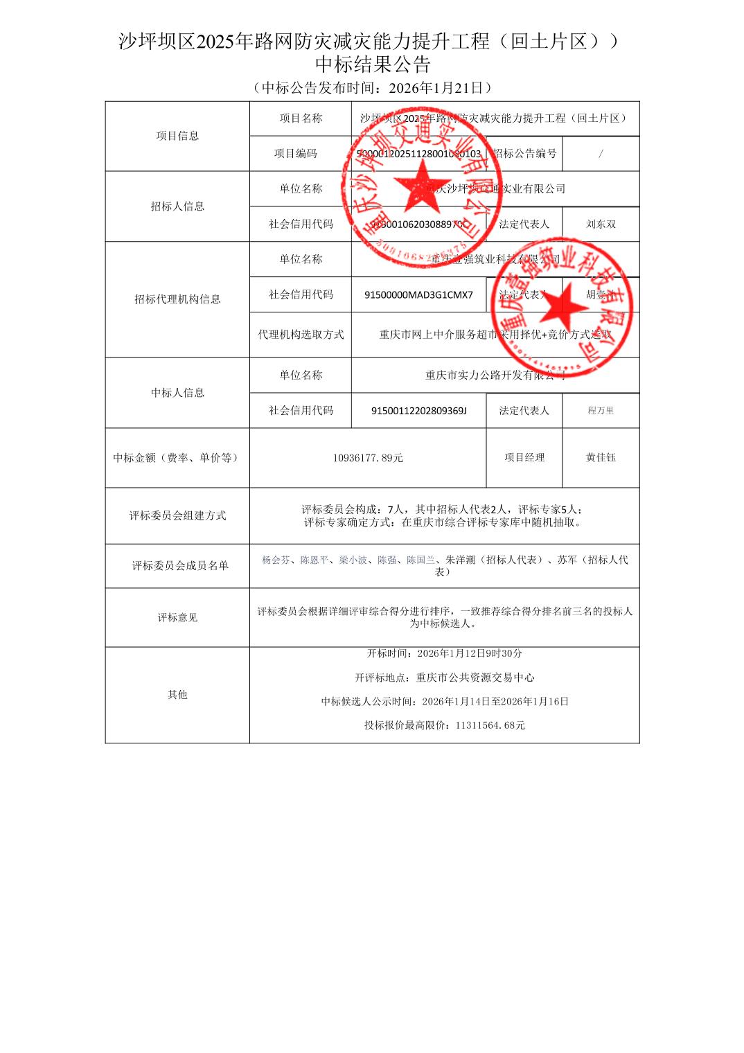 沙坪坝区2025年路网防灾减灾能力提升工程(回土片区))中标结果公告