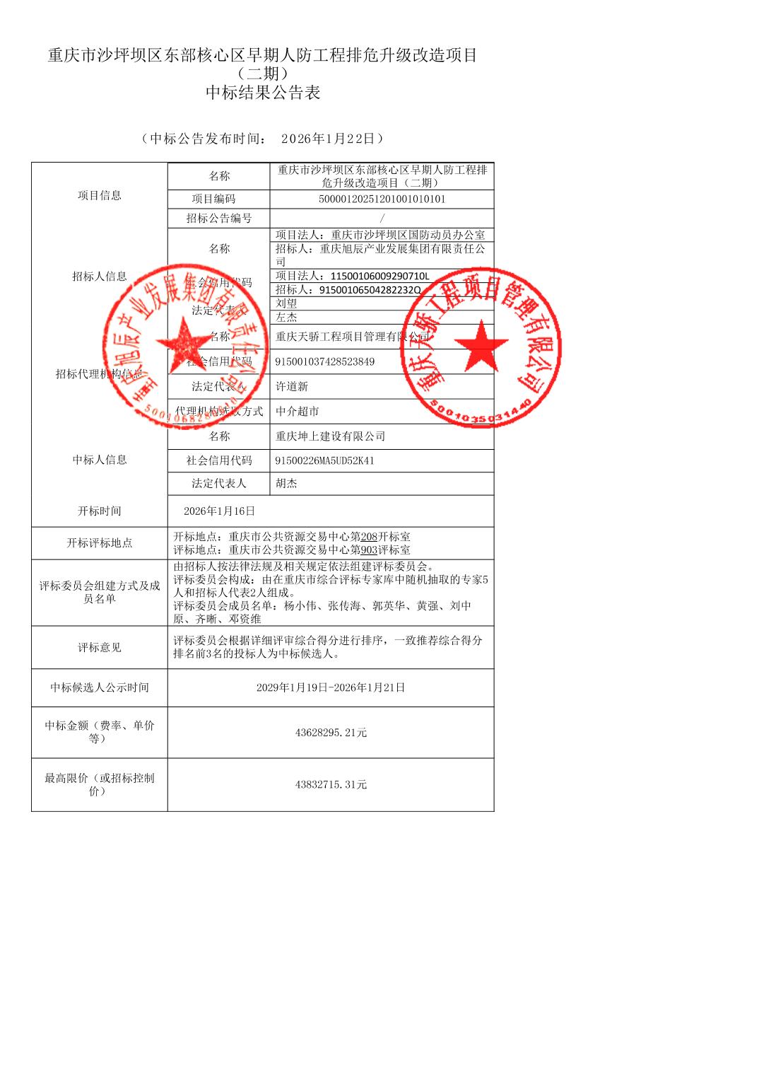 | 名称: | 重庆市沙坪坝区东部核心区早期人防工程排危升级改造项目(二期)中标结果公告表 | ||||