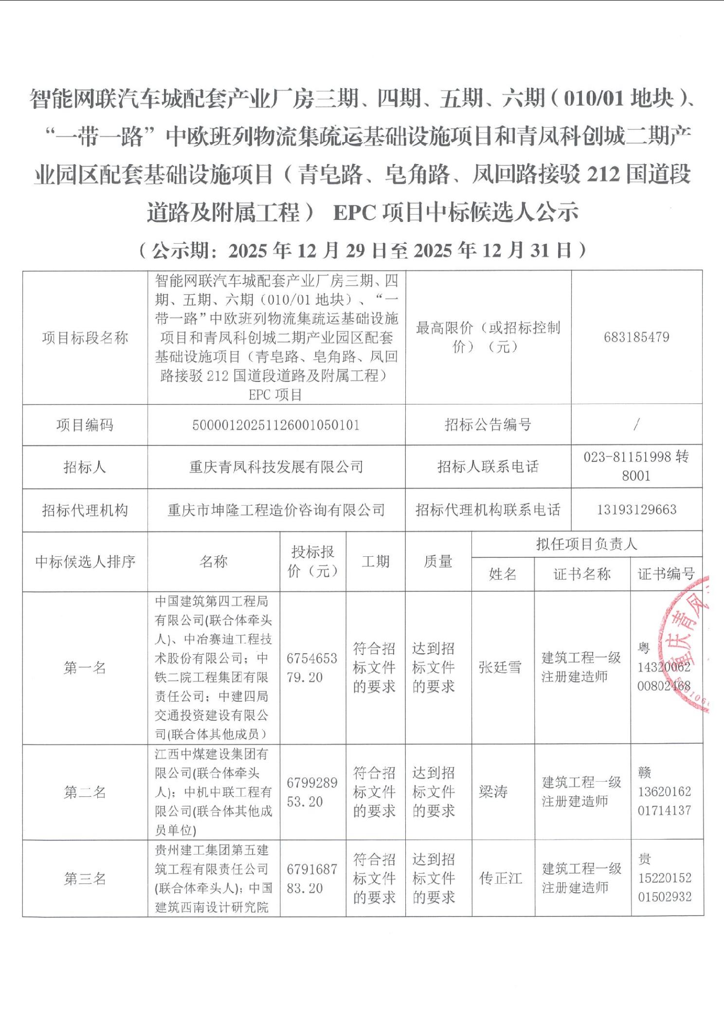 智能网联汽车城配套产业厂房三期、四期、五期、六期(010/01地块)、“一带一路”中欧班列物流集疏运基础设施项目和青凤科创城二期产业园区配套基础设施项目(青皂路、皂角路、凤回路接驳212国道段道路及附属工程) EPC项目中标候选人公示