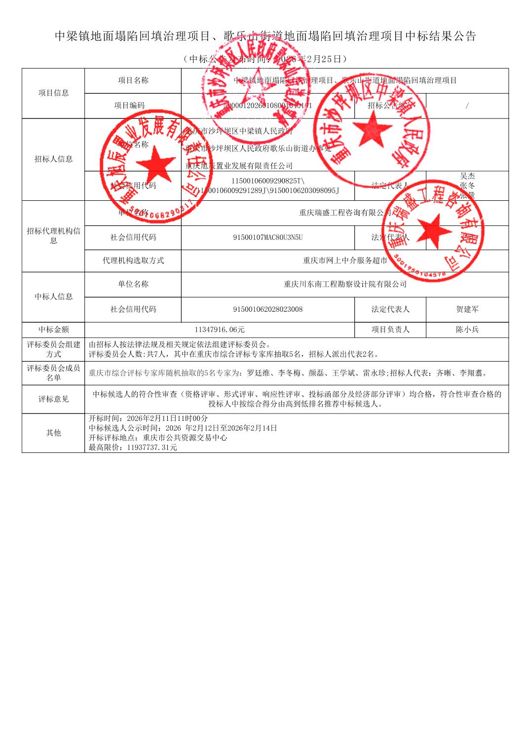 中梁镇地面塌陷回填治理项目、歌乐山街道地面塌陷回填治理项目中标结果公告