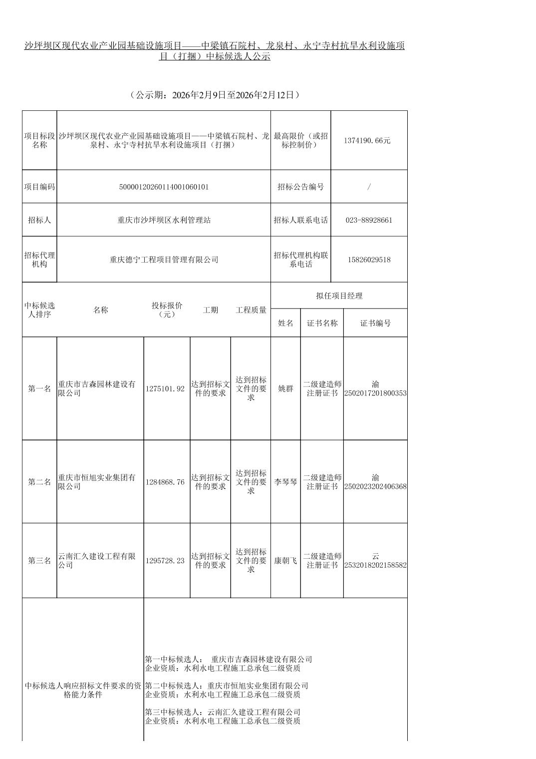沙坪坝区现代农业产业园基础设施项目——中梁镇石院村、龙泉村、永宁寺村抗旱水利设施项目(打捆)中标候选人公示