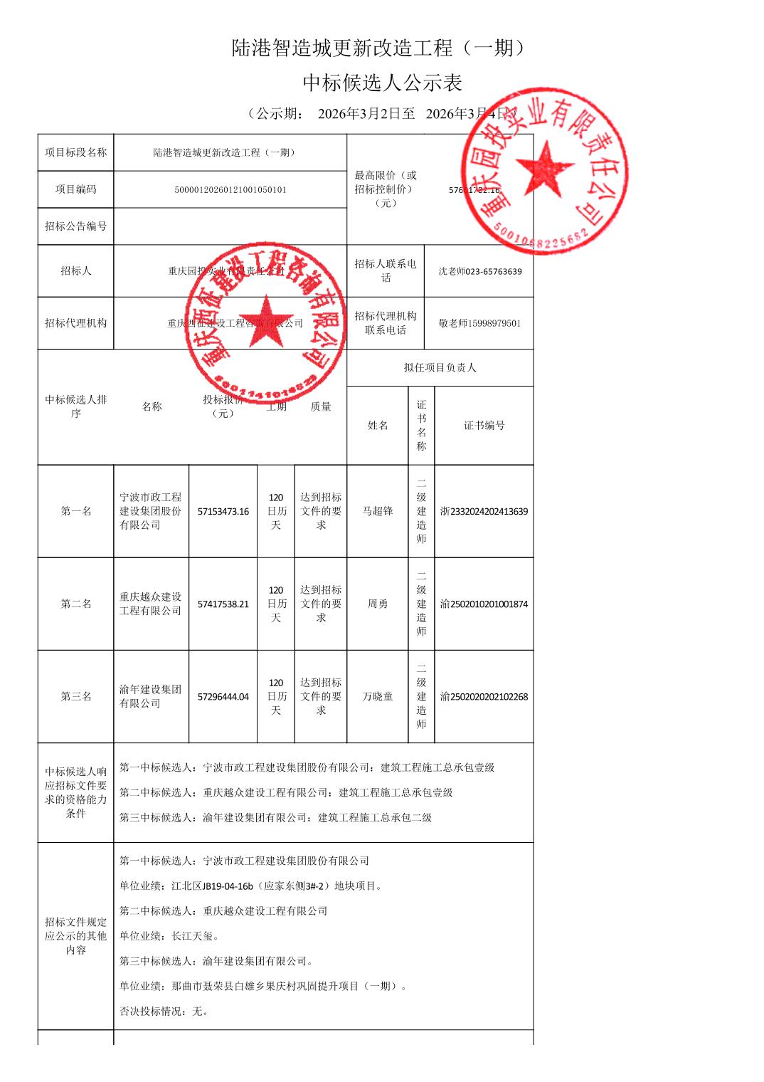 | 名称: | 陆港智造城更新改造工程(一期)中标候选人公示表 | ||||