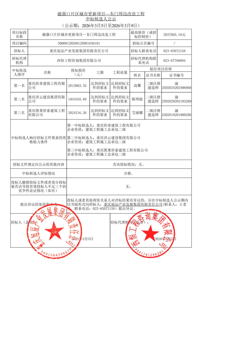 | 名称: | 磁器口片区城市更新项目—东门周边改造工程中标候选人公示 | ||||