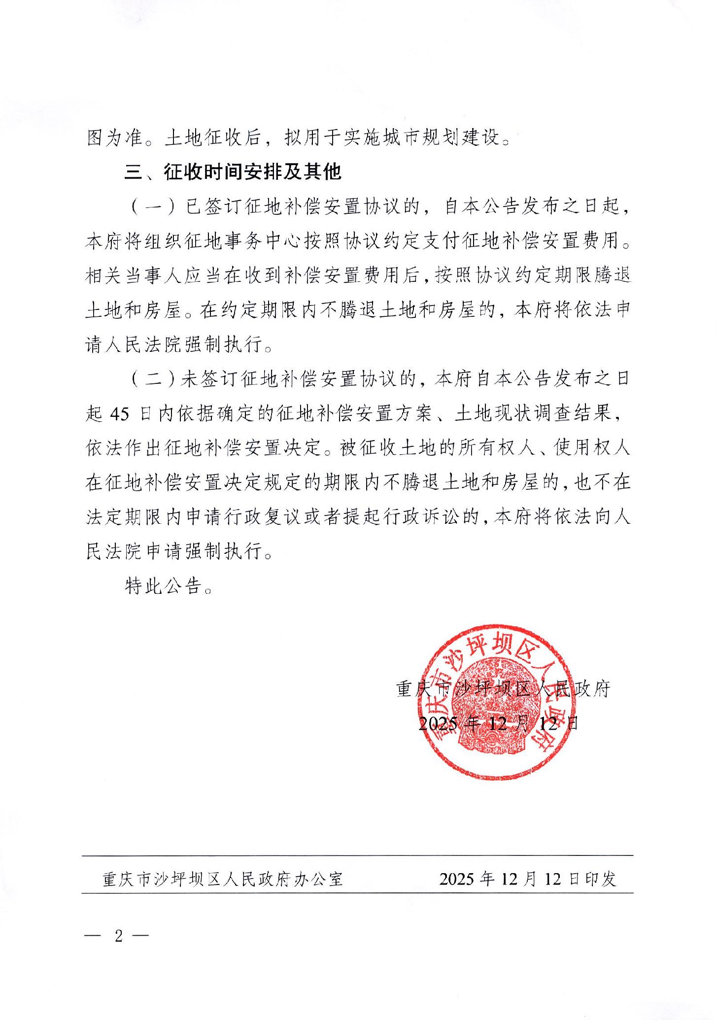 | 发布机构: | 沙坪坝区征地办 | 生成日期: | 2025-12-12 | 发布日期: | 2025-12-17 |