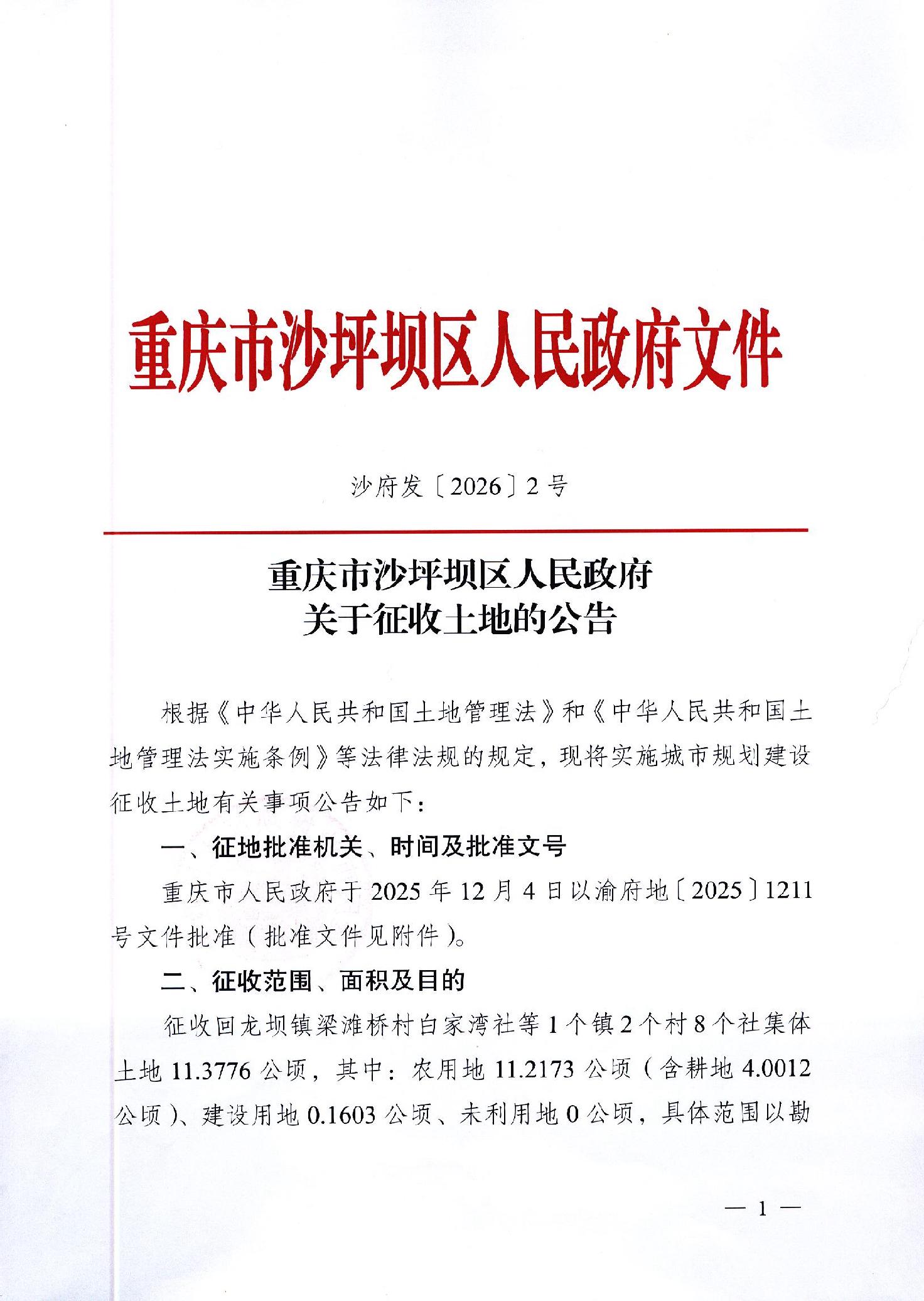 | 名称: | 重庆市沙坪坝区人民政府关于征收土地的公告 | ||||