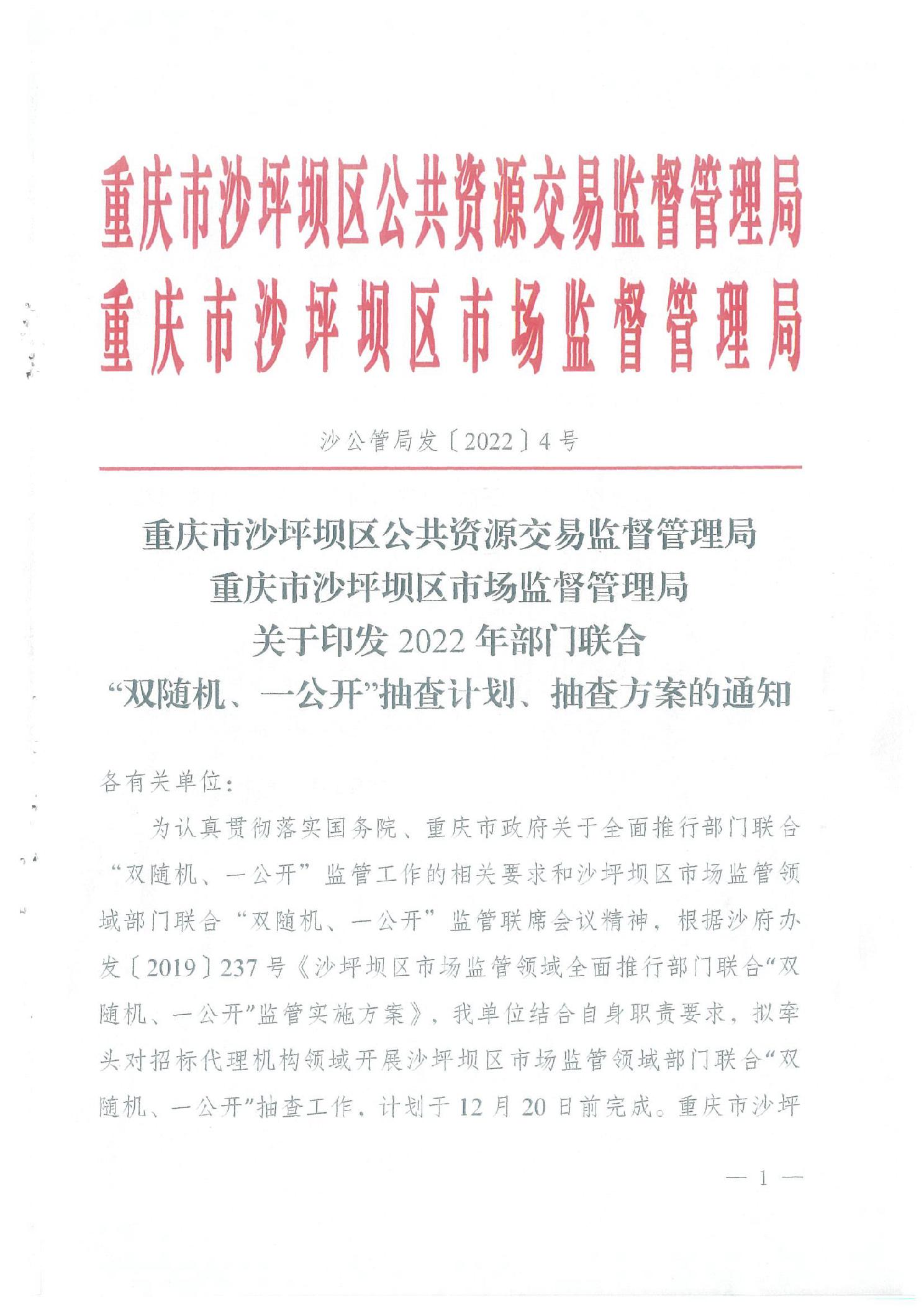 重庆市沙坪坝区公共资源交易监督管理局重庆市沙坪坝区市场监督管理局关于印发2022年部门联合”双随机、一公开“抽查计划、抽查方案的通知
