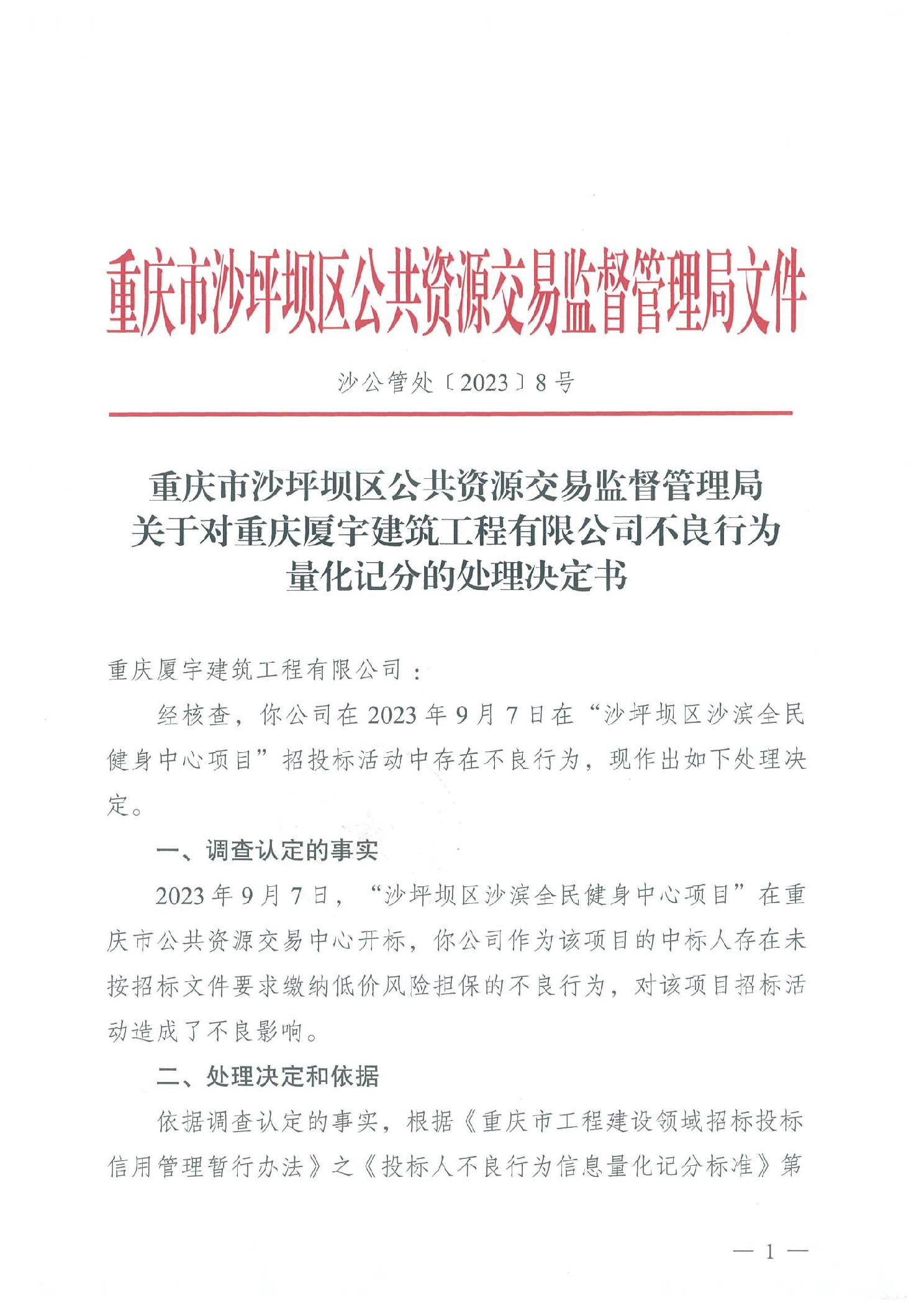 重庆市沙坪坝区公共资源交易监督管理局关于对重庆厦宇建筑工程有限公司不良行为量化记分的处理决定书