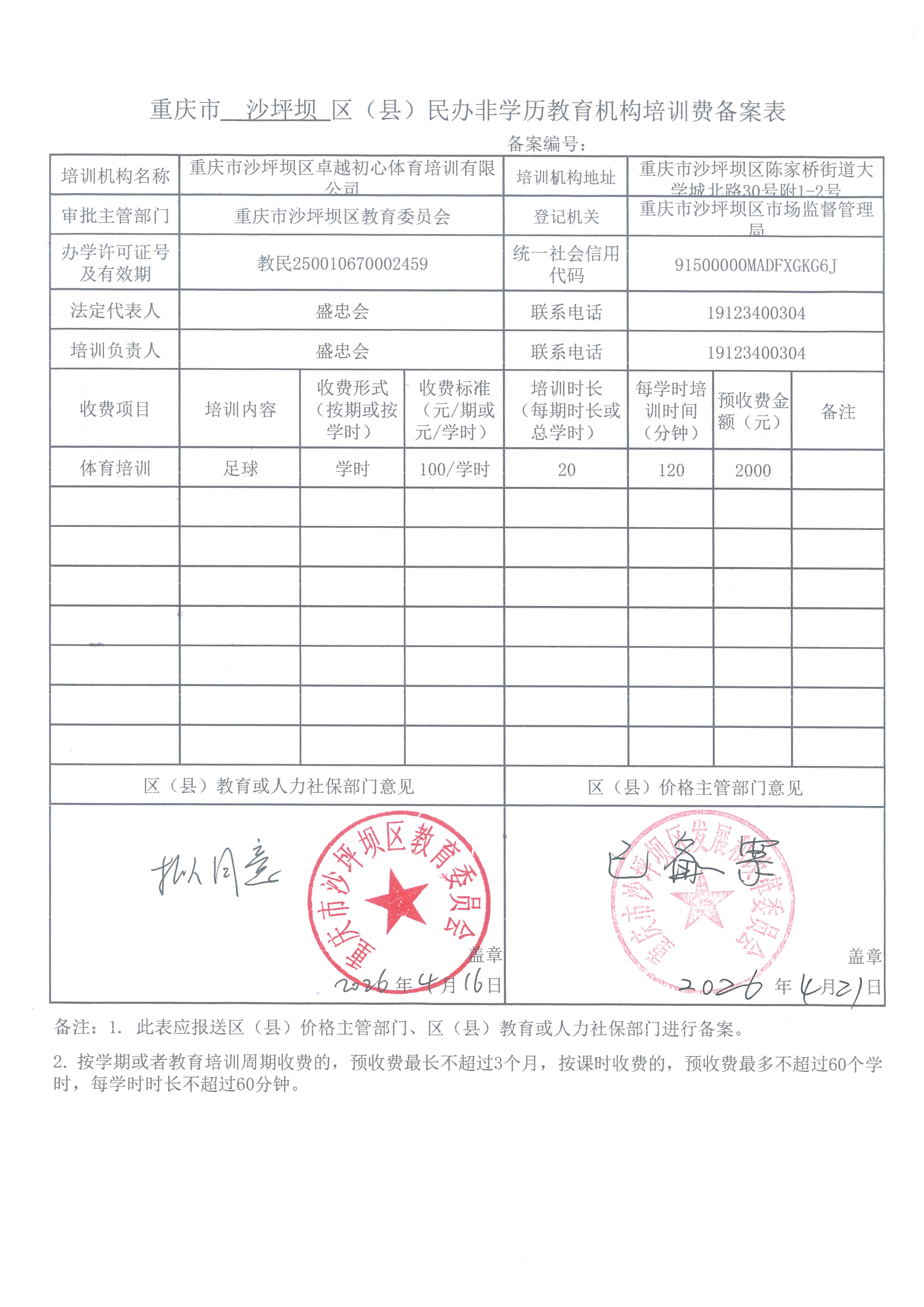 重庆市沙坪坝区卓越初心民办非学历体育培训有限公司收费备案情况