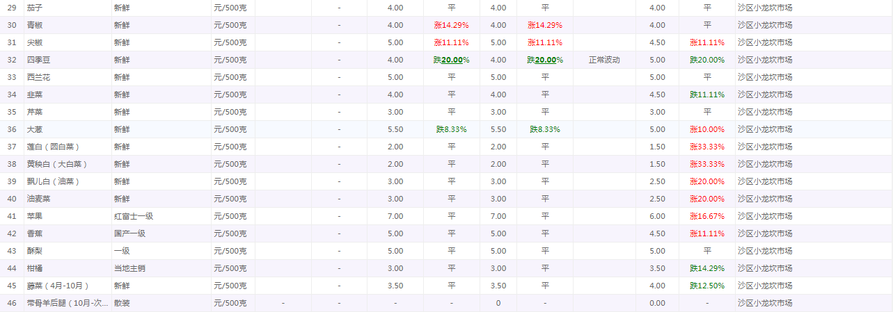 | 名称: | 粮油内禽蛋菜水产品等价格应急监测信息(沙区小龙坎农贸市场)采价日期(2026年4月22日) | ||||