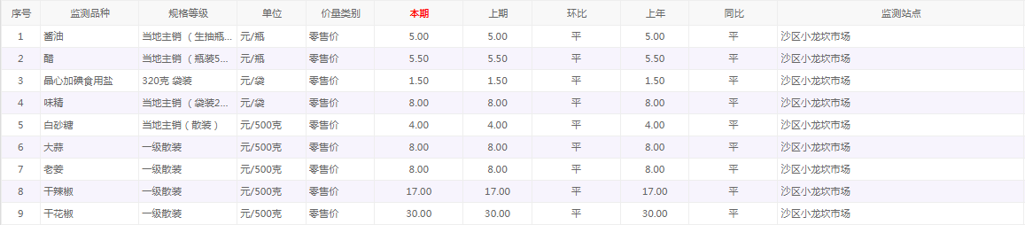 | 名称: | 调味品等价格监测信息(小龙坎农贸市场) (采价日期:2026年4月27日) | ||||