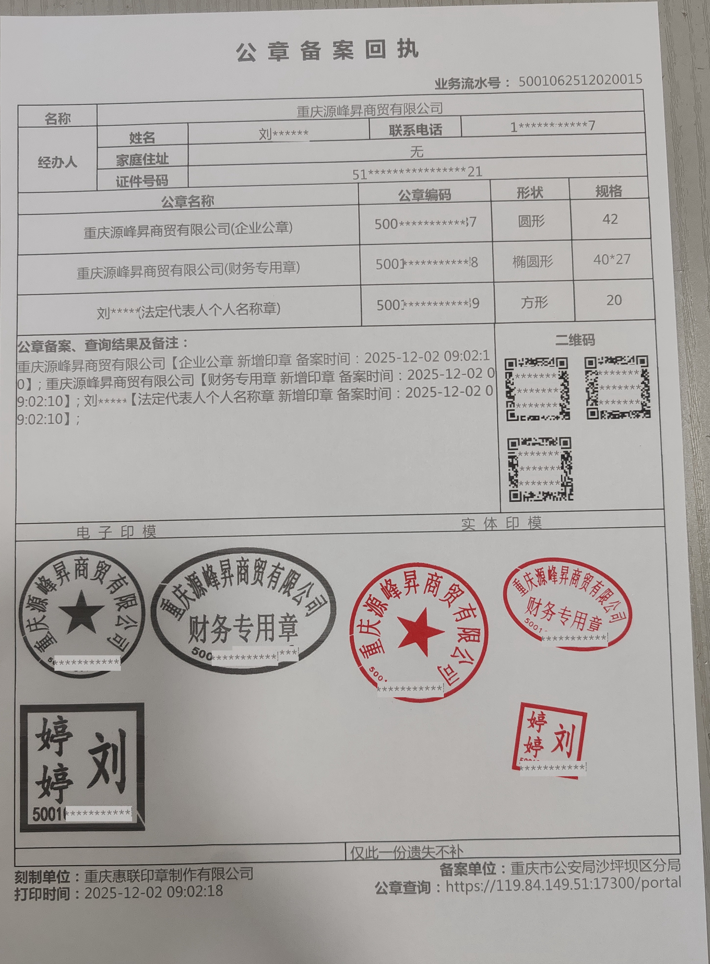 | 名称: | 公章刻制备案(重庆源峰昇商贸) | ||||