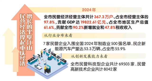 “当前,重庆先后涌现出了博赛矿业、智飞生物、小康控股等一大批具有全国影响力的民营企业。”康庄透露,2024年,全市民营经济经营主体共计367.3万户、占全市经营主体的97.8%,贡献GDP达19822.61亿元、占全市地区生产总值61.6%,贡献全市90.2%新增就业和47.8%税收收入。