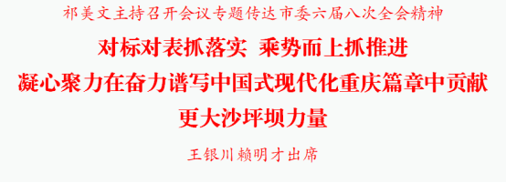 会议强调,深入学习宣传贯彻市委六届八次全会精神是当前和今后一个时期的重大政治任务。全区各级党组织和广大党员干部要按照全会统一部署,牢记嘱托、感恩奋进,开拓创新、锐意进取,突出以上率下,一级带一级、层层抓落实,扎实抓好市委六届八次全会精神宣传解读贯彻,全力攻坚冲刺坚决实现全年经济发展目标,全域全面推进风险隐患化解,持续提升城市本质安全水平,持之以恒推进全面从严管党治党,以实干实绩实效奋力开创沙坪坝现代化建设新局面,确保“十五五”开好局起好步。