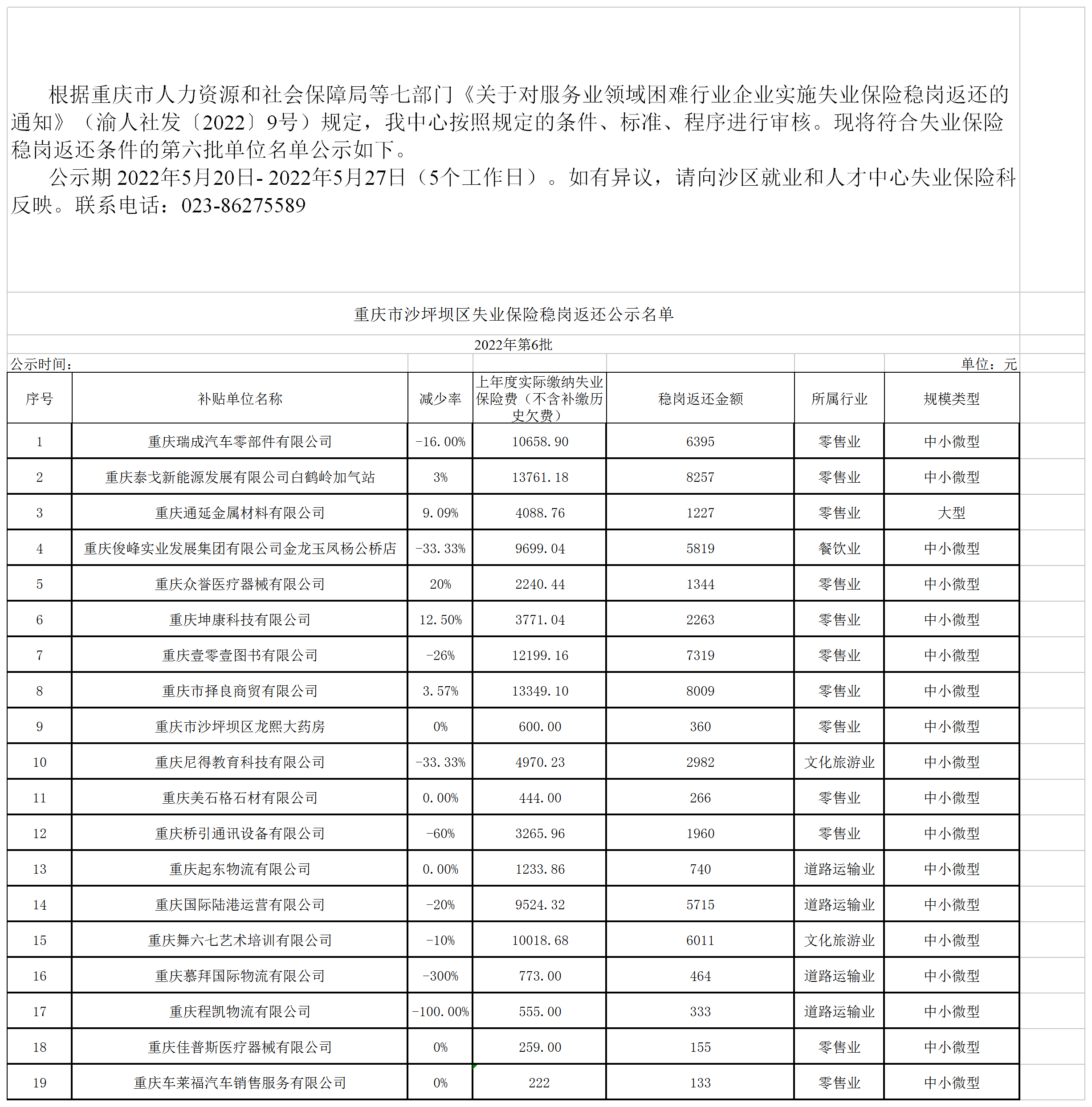 2022年重庆市沙坪坝区失业保险稳岗返还公示名单(第六批)