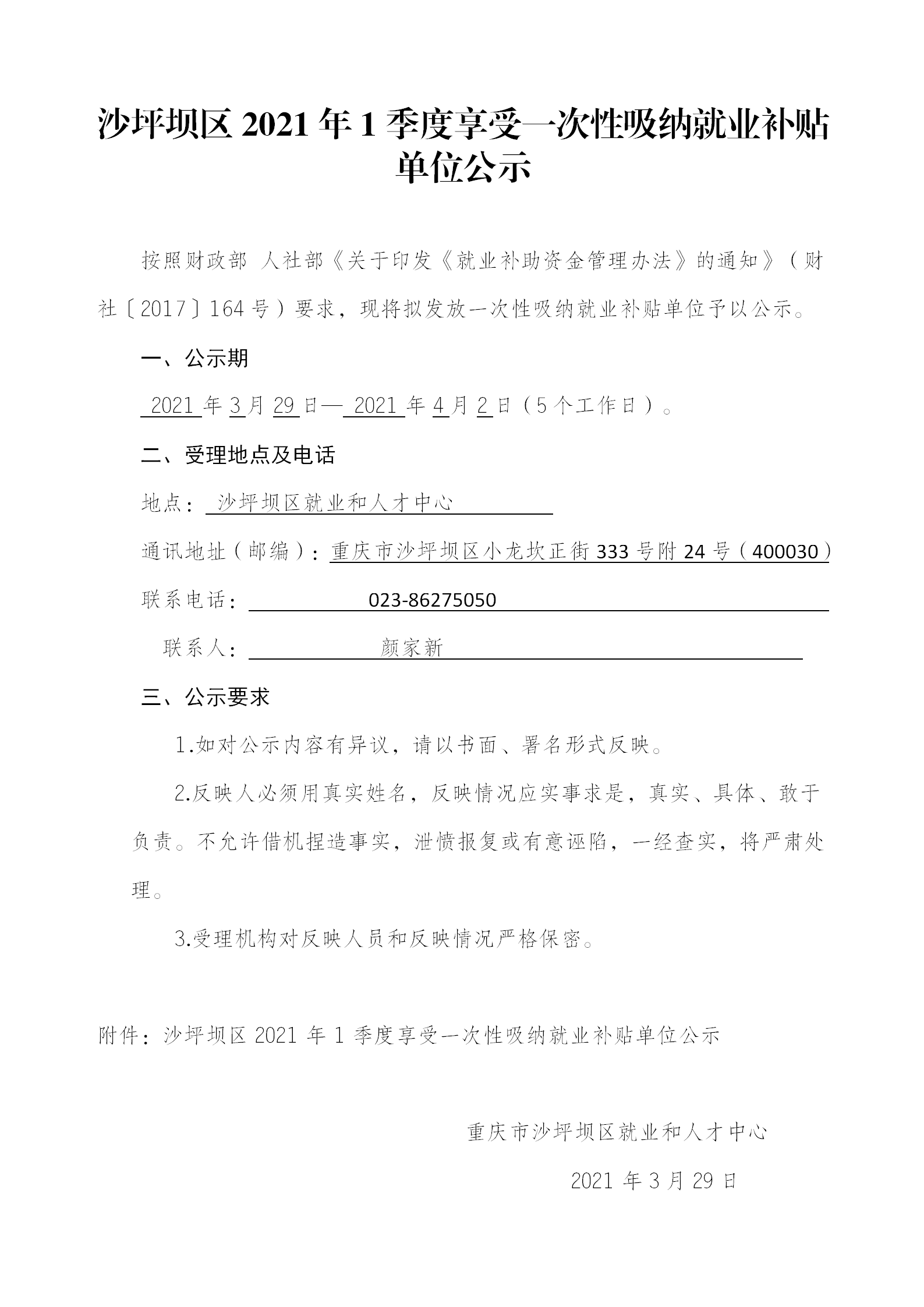 沙坪坝区2021年1季度享受一次性吸纳就业补贴单位公示