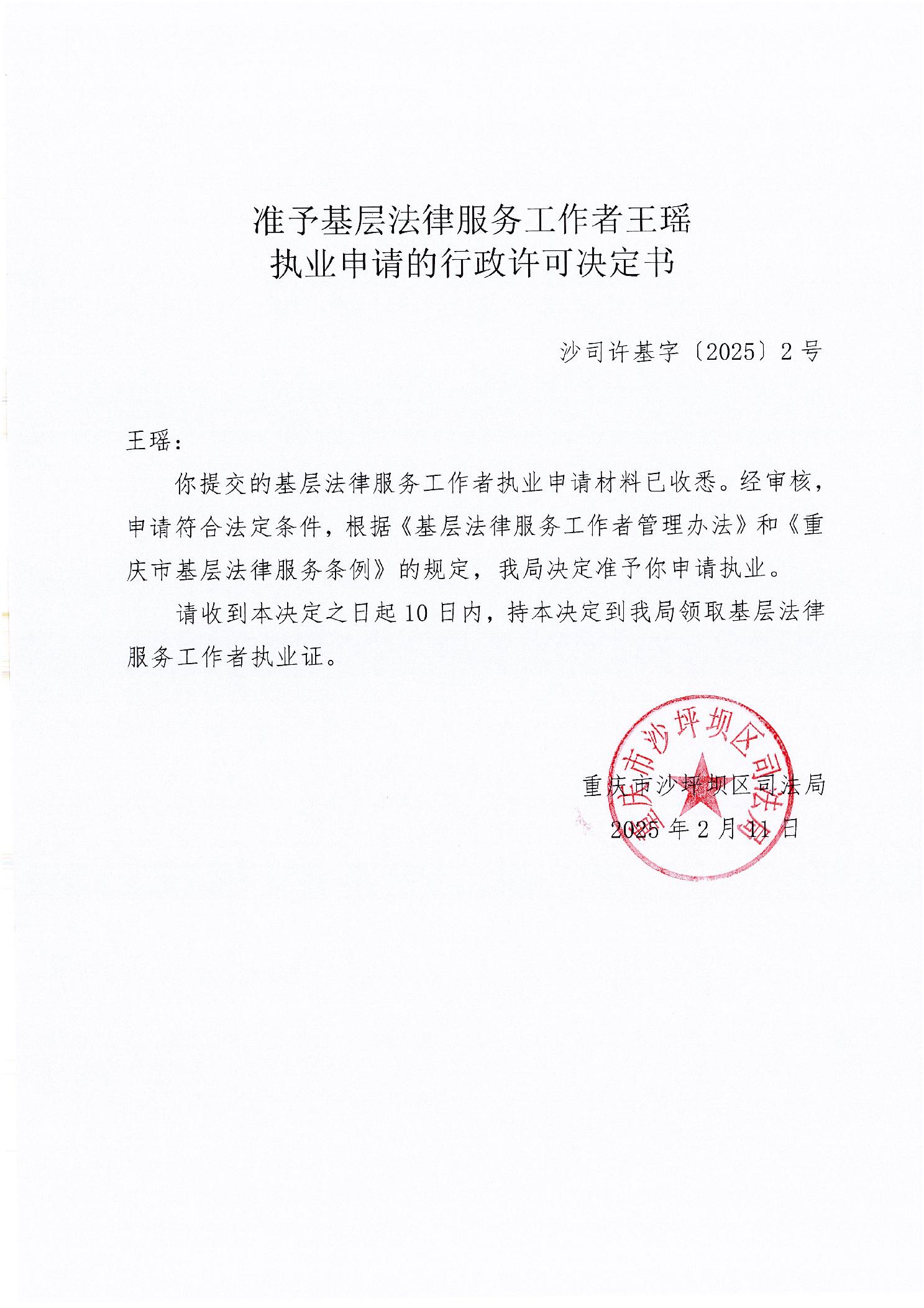 | 名称: | 基层法律服务工作者申请执业的行政许可决定书 | ||||