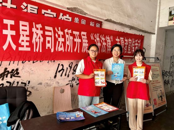 活动当天,天星桥司法所组织普法志愿者在商圈、农贸市场、公交站点等人流密集区域,以悬挂普法横幅、摆放流动展板、发放法治宣传传单等形式在街头走访宣导。