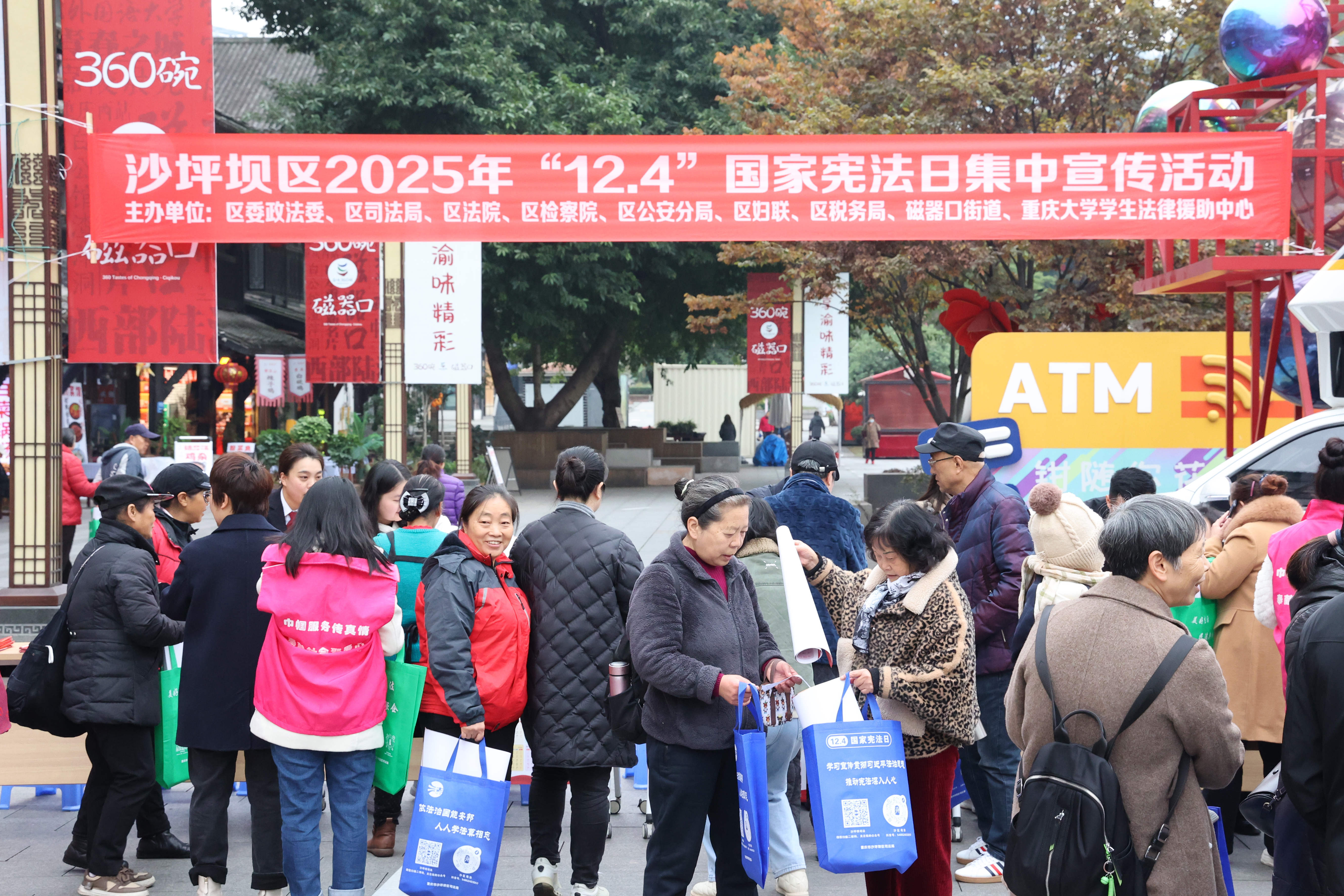 12月4日上午,沙坪坝区2025年“12·4”国家宪法日集中宣传活动在磁器口古镇牌坊广场拉开序幕。宪法知识互动区人流如织,群众纷纷抽取问答条,踊跃参与。
