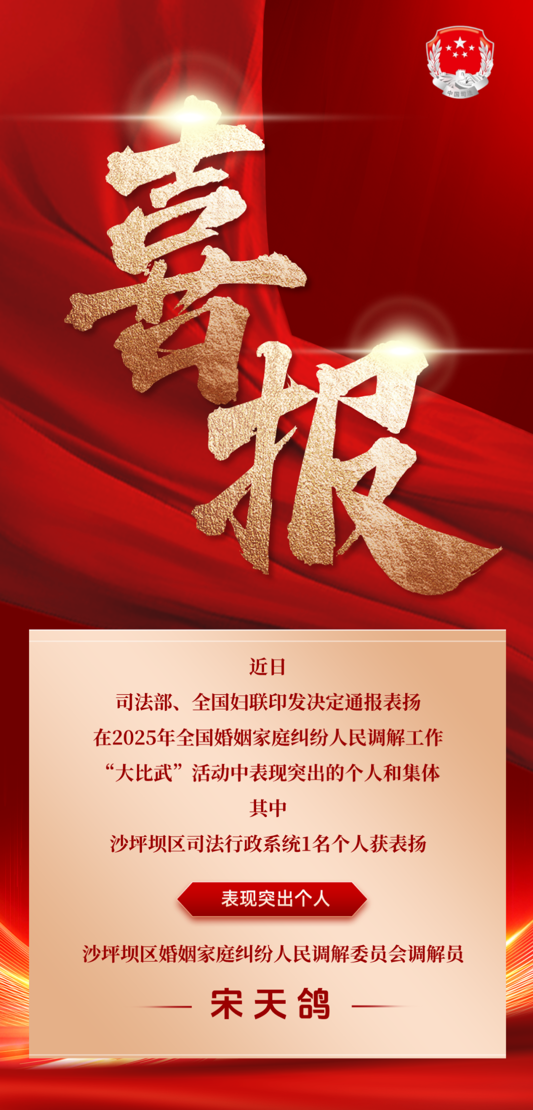 喜报!沙坪坝区婚姻家庭纠纷人民调解委员会调解员宋天鸽获司法部、全国妇联通报表扬