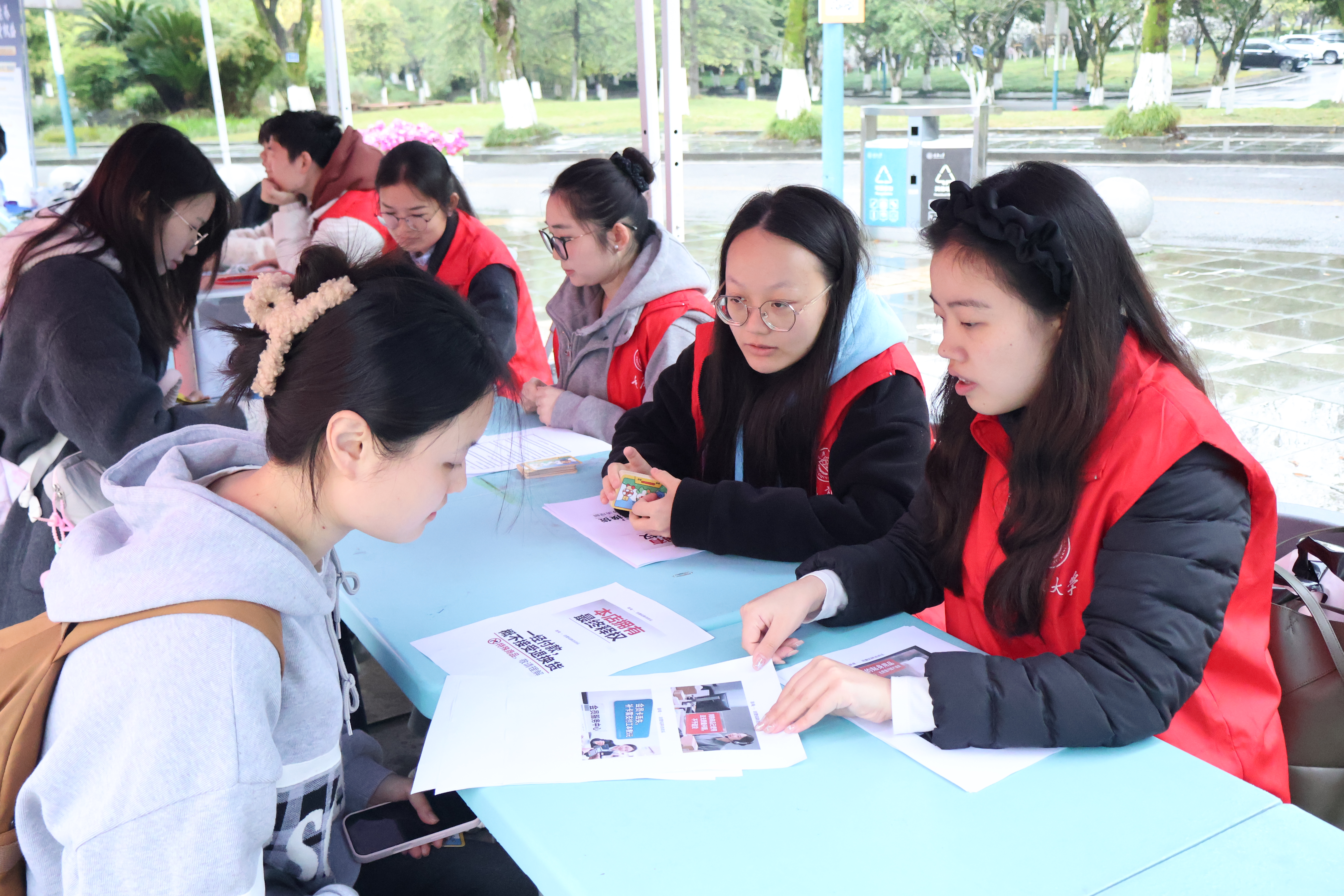 游戏区热火朝天,一旁的咨询台同样人头攒动。大学生志愿者轮流“坐诊”,面前摊着《中华人民共和国消费者权益保护法》相关宣传资料。“网购盲盒拆开不喜欢能退吗?”“培训班跑路了,预缴的学费还能追回吗?”......问题一个接一个,志愿者一边记录,一边用通俗易懂的语言为其解答。