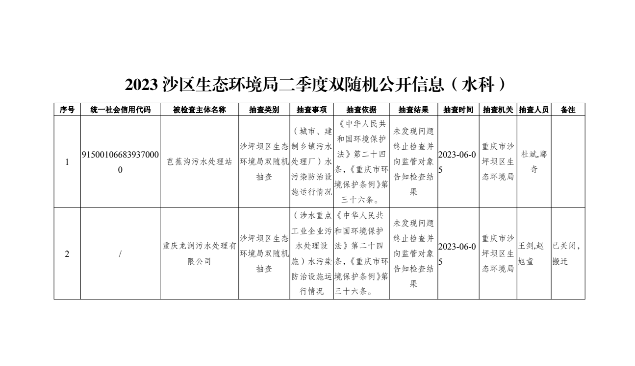 | 名称: | 2023年沙坪坝区生态环境局二季度双随机信息(水科) | ||||