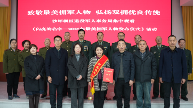 区退役军人事务局组织全局干部职工、部分军休干部、自主择业军转干部和社区群众代表集中观看《闪亮的名字—2025年最美拥军人物发布仪式》,共同感受新时代拥军模范的责任担当与赤子情怀。作为扎根本地的拥军典型,许灵同志始终将军人军属的急难愁盼放在心上,在拥军工作中交出了亮眼答卷。针对退役军人就业创业痛点难点,她积极整合社会资源,成立沙坪坝区退役军人就业创业促进会,先后为千余名战友及军创企业提供就业创业咨询,为数百名战友提供免费技能培训,为退役军人从“战场”到“职场”的平稳转型架起了坚实桥梁。同时,她深知婚恋问题是困扰部分大龄官兵的“心头事”,主动牵头成立军民情缘工作室,常态化开展军地联谊活动,精心搭建交友平台,成功帮助数十对军地青年喜结连理,让官兵能够心无旁骛投身国防和军队建设,用贴心服务筑牢部队后方“幸福线”。