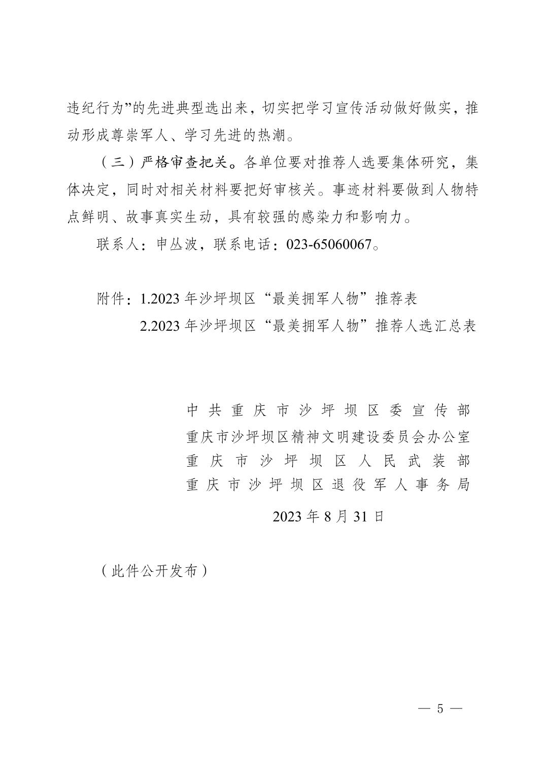 中共重庆市沙坪坝区委宣传部 重庆市沙坪坝区精神文明建设委员会办公室 重庆市沙坪坝区人民武装部 重庆市沙坪坝区退役军人事务局关于开展2023年沙坪坝区“最美拥军人物”学习宣传活动的通知