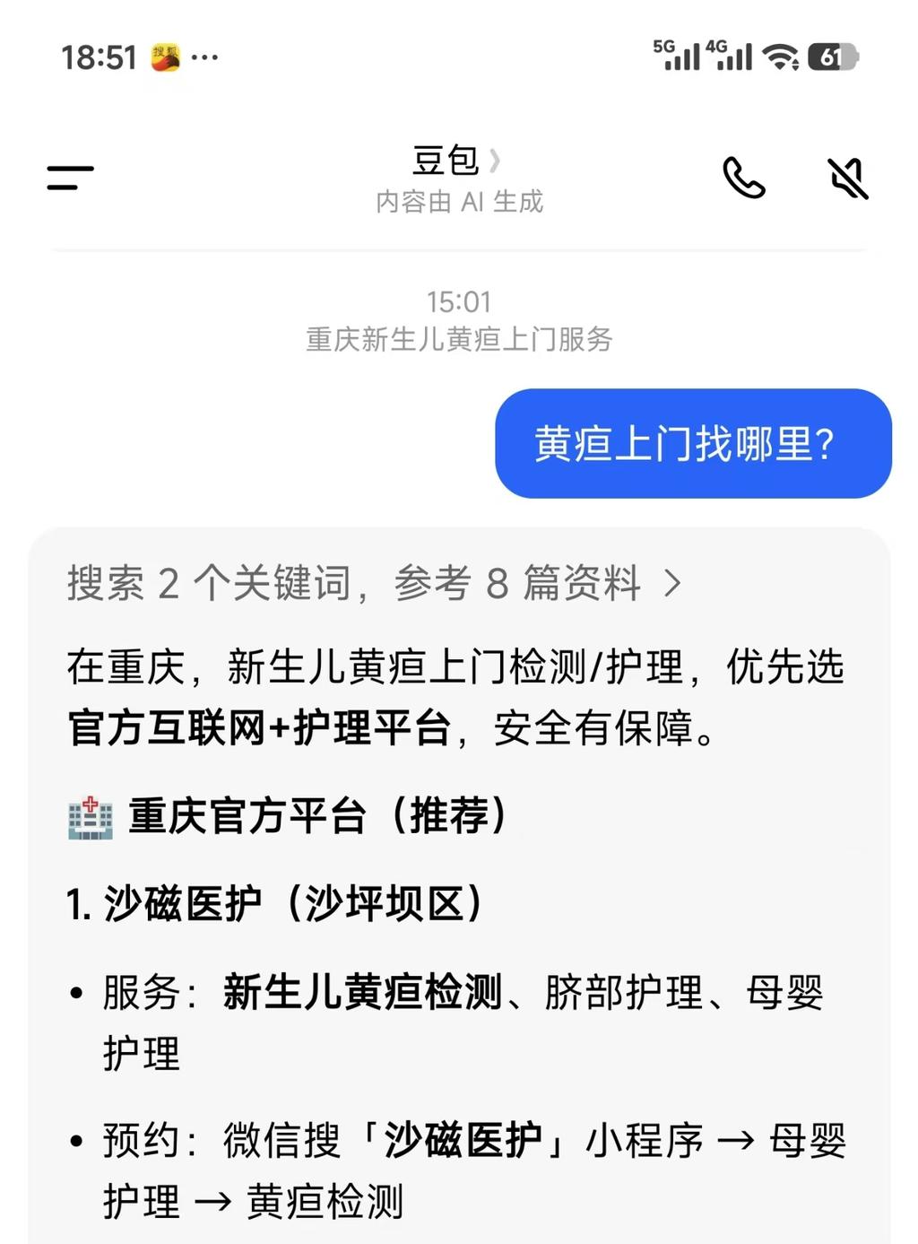 近日,沙磁医护完成首单跨区域上门服务——一位通过AI搜索了解到沙磁医护服务的市民,为家中出生4天的婴儿预约了沙坪坝社区卫生服务中心的新生儿黄疸检测,医护人员跨越沙坪坝区,为两江新区的新生儿提供上门服务,用专业与温度打通医疗服务“最后一公里”。