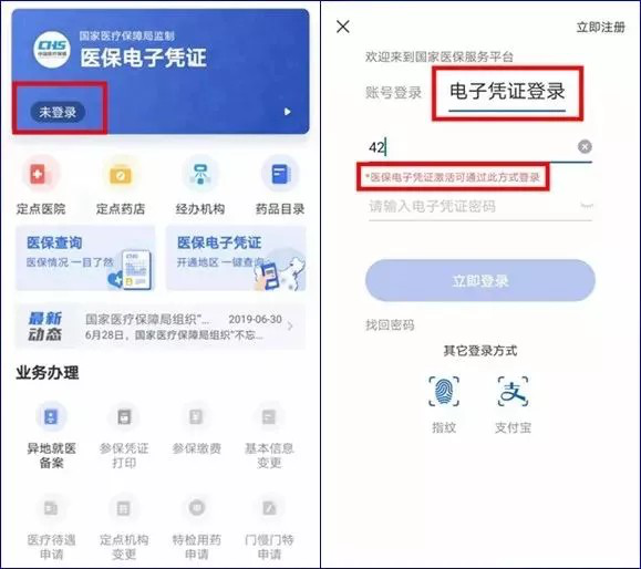 进入国家医保服务平台APP首页, 需要先登录个人医保电子凭证。首次进入登录页面,有【账号登录】和【电子凭证登录】两种方式。