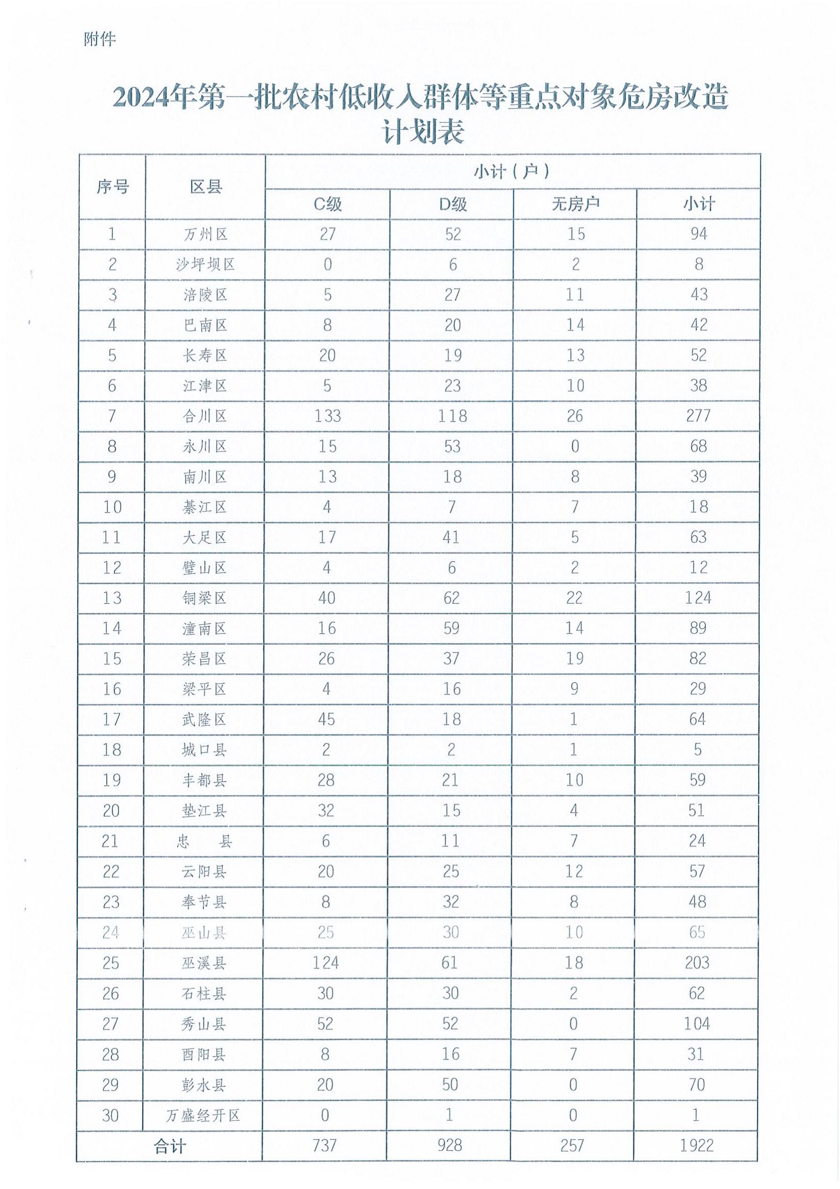 重庆市住房和城乡建设委员会关于提前下达2024年第一批农村低收入群体等重点对象危房改造计划的通知
