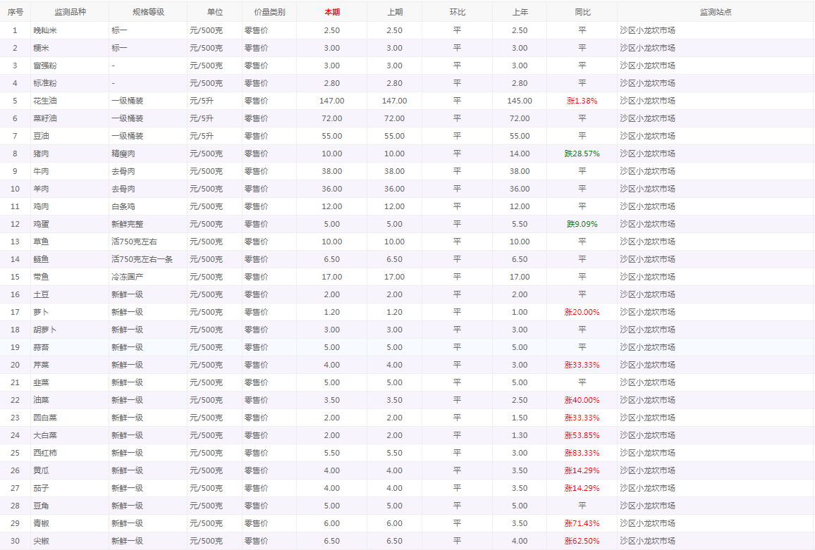 粮油内禽蛋菜水产品等价格应急监测情况(小龙坎农贸市场)采价日期(2026年1月20日)