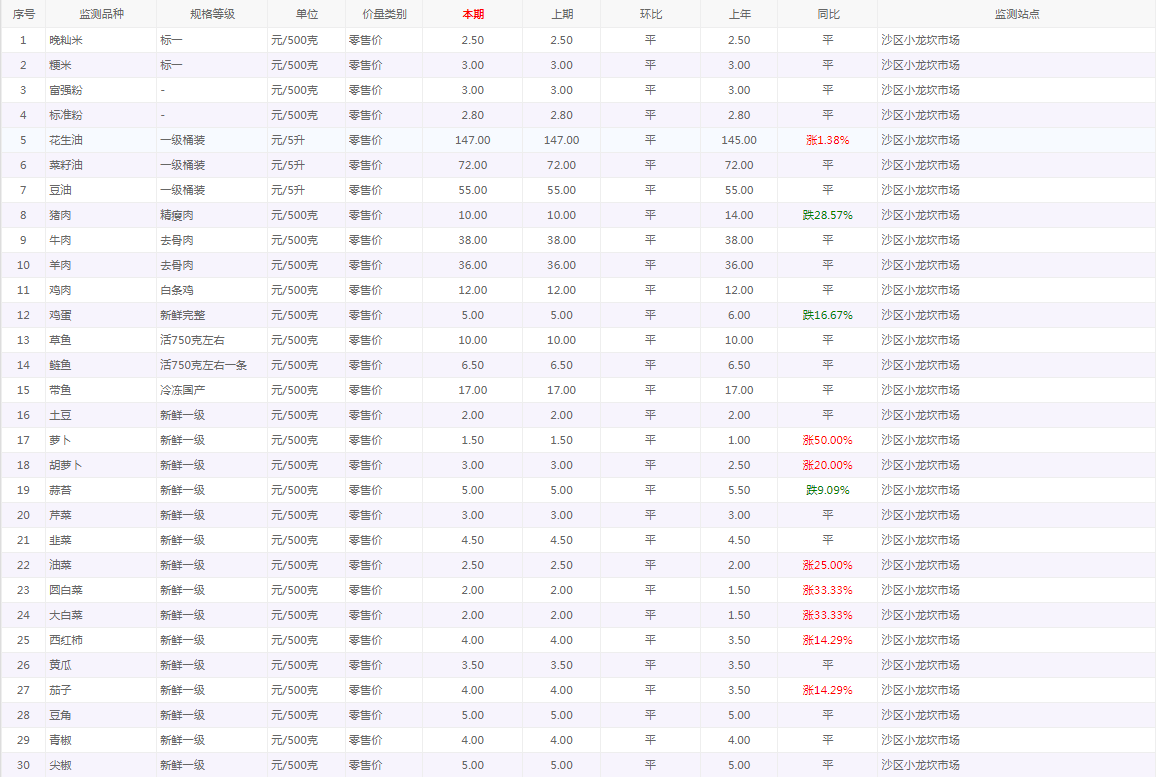 粮油内禽蛋菜水产品等价格应急监测情况(小龙坎农贸市场)采价日期(2026年4月9日)