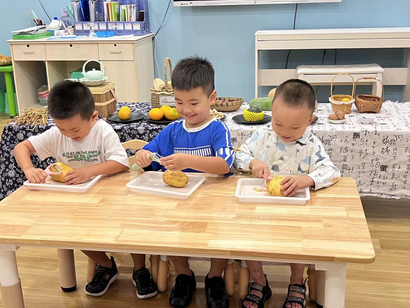 活动中,志愿者通过展示稻谷、玉米、红薯等实物,结合趣味问答,生动讲解不同农作物的外形特征与生长过程,引导孩子们辨识秋粮、了解自然。在实践环节,孩子们在志愿者手把手的指导下学习削土豆皮,手持削皮器认真操作,亲身体验从食材处理到烹饪准备的劳动过程,现场气氛积极热烈。