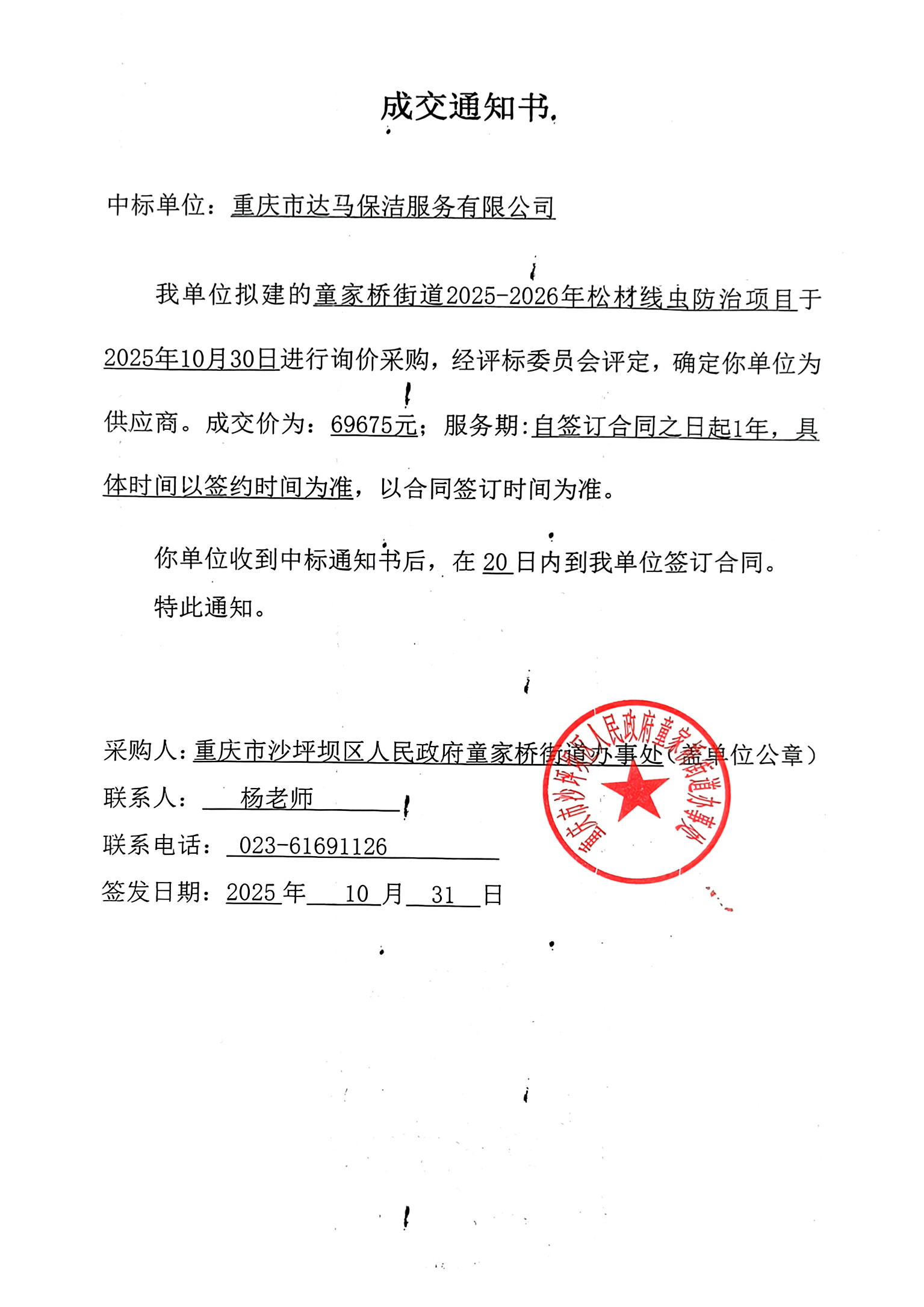 | 名称: | 童家桥街道2025-2026年度松材线虫防治项目成交通知书 | ||||