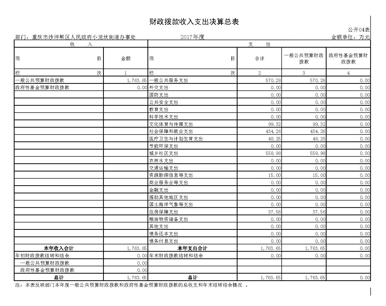 本部门2017年度收入总计1,763.65万元,支出总计1,763.65万元。与2016年决算数相比,收支减少157.32万元、下降8.19%。主要原因是严格按照机关事业单位养老保险改革要求调整离退休人员待遇支付方式,同时严格压缩行政开支,相应减少基本支出48.32万元,减少基层政权和社区建设等项目支出109万元。
