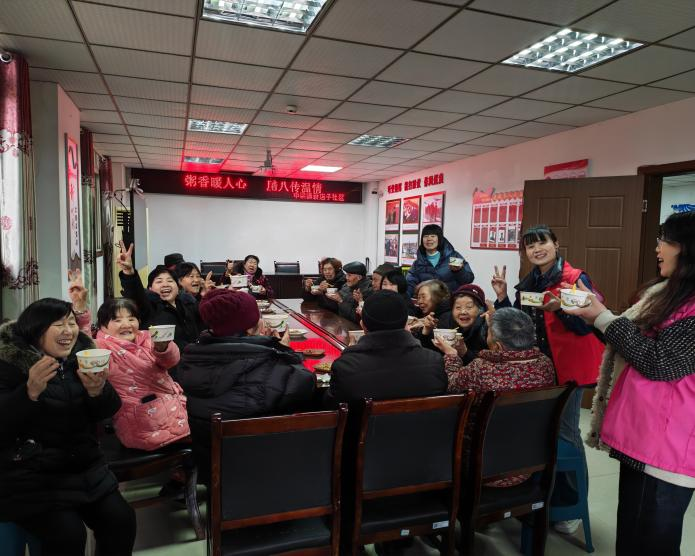 活动现场,志愿者用生动通俗的语言,讲述了腊八节的起源传说以及腊八粥的养生功效,穿插趣味问答互动,老人们积极参与、踊跃作答,现场掌声不断。互动结束后,志愿者们开始给老人们分粥,甜味腊八粥的清甜与咸味腊八粥的鲜香交织弥漫,勾动着大家的味蕾。“大爷,您尝尝甜粥,里面放了您爱吃的红枣。阿姨,这碗咸粥加了芋头和瘦肉,您慢慢吃”,志愿者们化身“暖心使者”,根据老人们的口味偏好,将一碗碗热气腾腾的腊八粥送到手中,同时细心询问饮食感受,及时添粥添菜。老人们围坐在一起,一边品尝着暖粥与特色小菜,一边闲话家常,分享着生活中的趣事与感悟,原本独居的孤单在欢声笑语中消散,取而代之的是邻里相聚的温情与热闹。