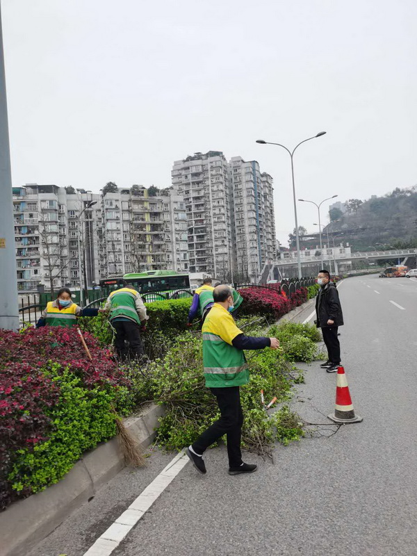 在此次绿化整治中,合理运用色叶植物,全线中分带灌木层以色块韵律排列种植红继木、金叶女贞,乔木层则调整原有紫薇的排列规律呈组团式栽植,两侧行道树全线更换为乡土树种黄葛树,此次累计栽植各类乔灌木总计133500余株。