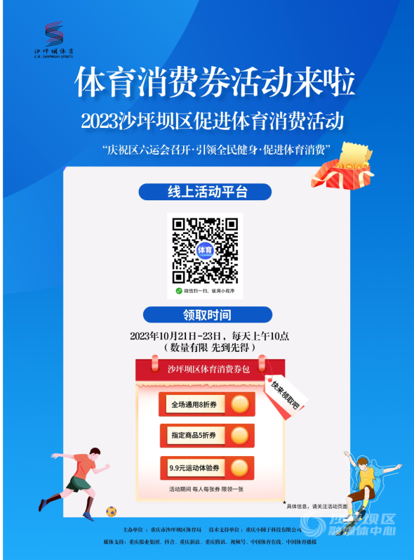 10月21日至23日将面向社会发放首批近5000张的体育惠民消费券,连续三天,市民朋友可在每天上午10点,关注“沙坪坝体育”微信公众号,回复“消费券”,准时抢券,畅享运动福利。