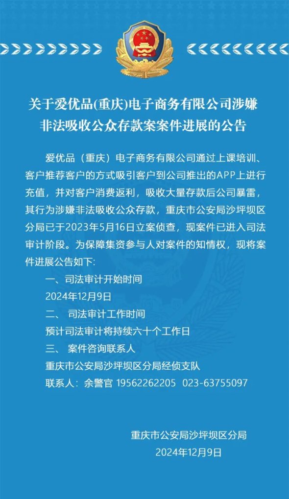 关于爱优品(重庆)电子商务有限公司涉嫌非法吸收公众存款案案件进展的公告