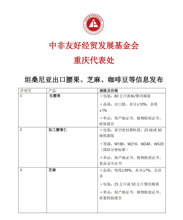 经过与坦桑尼亚等非洲相关国家反复沟通,现已打通(芝麻、腰果、咖啡豆)相关产品进口的成熟渠道。欢迎各单位企业到沙坪坝区中非经贸产业园中非友好经贸发展基金会重庆代表处了解详细参数与样品,如有意向企业可提供相关物品需求并与联系。